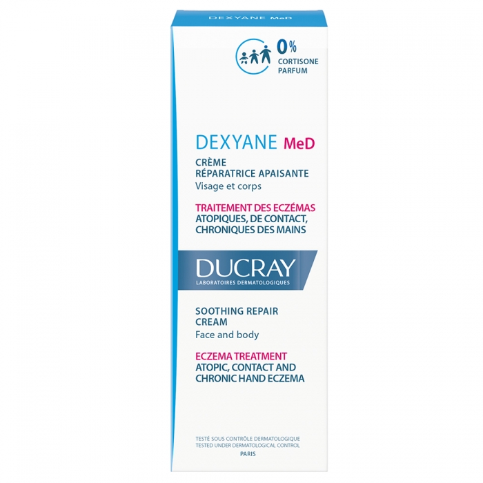La crema DUCRAY Dexyane Med es un reparador calmante, indicado para el tratamiento del eccema atópico, eccema de contacto y manos crónicas. Se puede aplicar tanto en la cara como en el cuerpo, y ha sido dermatológicamente probado. Esta crema está formulada sin perfume ni cortisona y viene en un envase de 100 ml.