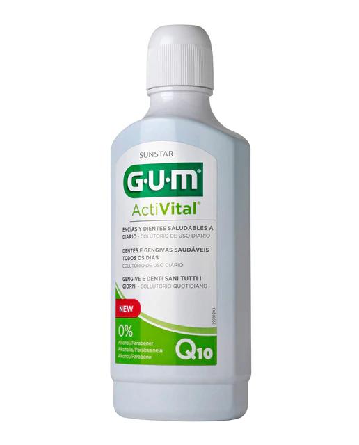 El colutorio Gum Activital combina los beneficios de antioxidantes como la Coenzima Q10, la granada, el jengibre y la manzanilla. Este producto preserva y fortalece tanto los dientes como las encías. Además, está formulado sin parabenos, ingredientes nocivos, alcohol ni sulfatos (SLS), y ofrece un sabor a menta fresca.